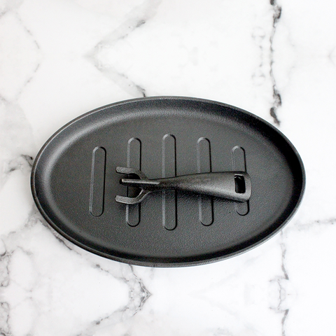 Предварительно приправленная овальная чугунная сковорода с деревянной тарелкой